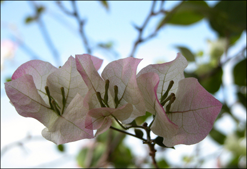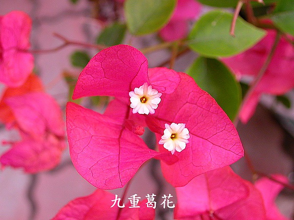 九重葛的花季很長,種在溫暖的南部又比北部更易開花。它的花大而明顯,三片合生,像只口袋。但其實這些或紅或紫或粉白的花,並不是真正的花朵,而是花苞,真正的花朵是被花苞包在裡頭的小白花。