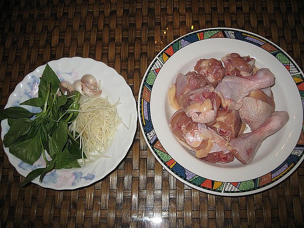 材料:切塊雞腿肉 茶油 薑絲 蒜頭 九層塔 酒 鹽