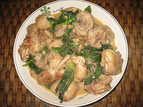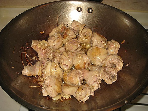 作法:茶油加薑絲及蒜頭先爆香-->加雞腿肉塊拌炒 (再加點水悶煮一下至湯汁收乾)