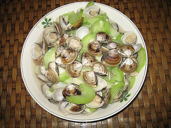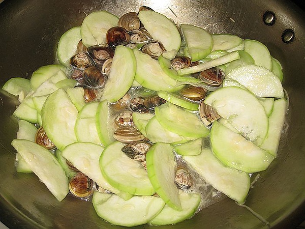 作法:薑絲 蒜 先爆香 再放絲瓜下去炒 接下來放蛤蜊略翻炒一下-->加水(酌量) 鹽 一起悶煮