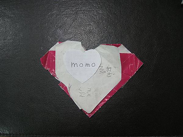 (這個愛心裡面還包了一個紫色小亮片+一張小塗鴉:畫一支小傘下寫了momo+小宸的名字~piano都畫在圖畫裡囉)