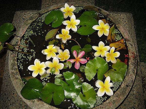 最喜歡撿掉落的雞蛋花裝飾在小水池裡