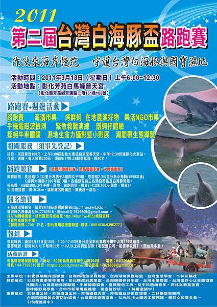 最近由於國光石化開發案,彰化溼地與中華白海豚的危機,備受各界關注。去年,彰化縣環境保護聯盟響應國際生物多樣性年,主辦第一屆白海豚盃路跑賽,吸引了約1200人報名參與。今年,彰化環盟將以「守護國寶濕地、保育白海豚」為主題,再次邀請全國民眾齊聚彰化海岸,一面慢跑,一面感受國寶級溼地的美,認識素有「台灣媽祖魚」之稱的中華白海豚,強健自身與台灣環境的體魄。