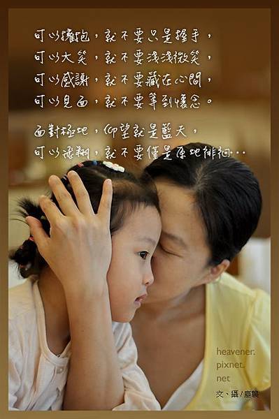 可以擁抱,就不要只是握手, 可以大笑,就不要淺淺微笑, 可以感謝,就不要藏在心間, 可以見面,就不要等到懷念。 面對極地,仰望就是藍天, 可以飛翔,就不要僅是原地徘徊…