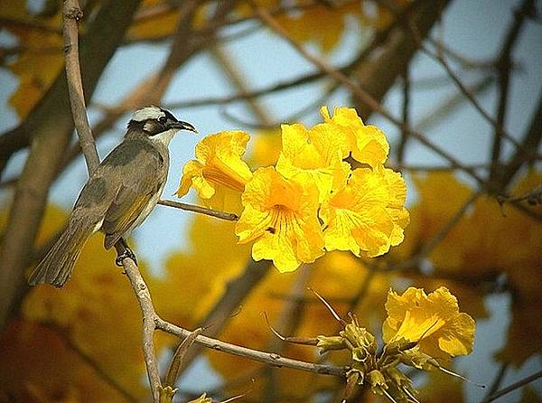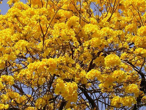 黃金風鈴木,為巴西國花,是一種會隨著四季變化而更換風貌的樹。春天枝條葉疏,開著漂亮的黃花;夏天長葉結果莢,幸運的話,還能見到翅果紛飛的驚喜;秋天枝葉繁盛,一片綠的景象;冬天枯枝落葉,呈現出淒涼之美。春、夏、秋、冬,則展現出不同的風味。期待每年三月黃花盛開,邀你共賞。但!提醒你可要小心,不要觸碰到其花及果實上的細毛,否則是會癢癢的喔!