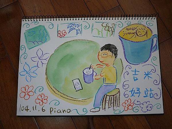 (圖 一: 樸實藝術課的三分鐘”快炒塗鴉”~Piano常常來不及在家畫好,但就算只有10分鐘仍不輕易缺席,只要進教室靈感就來了,就有故事/心情可以分享)